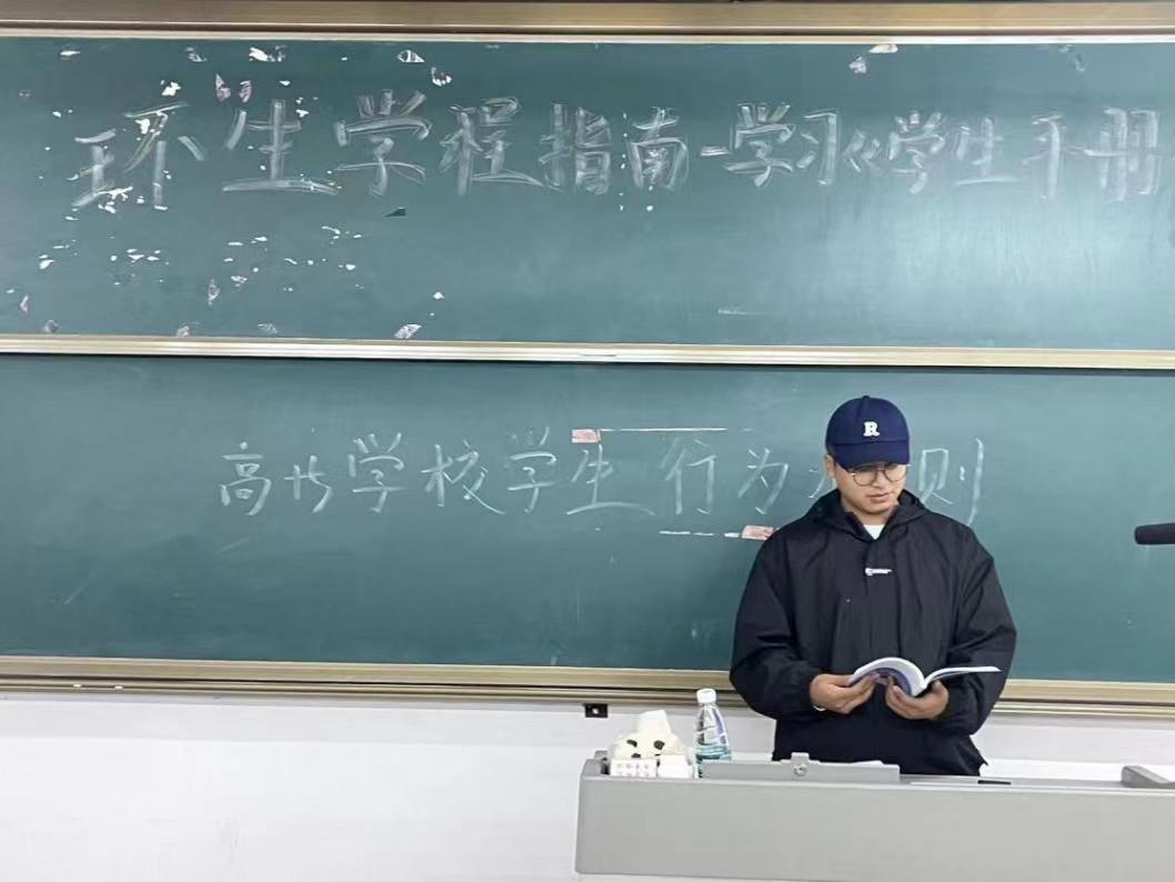 许富斌学长为大家介绍了普通高等公司员工管理规定,让大家了解了员工的权利与义务、学籍管理、毕业与结业等。通过对校内秩序、奖励与处分的学习,让环生系新生知晓准则规范,形成自我约束意识. 守规矩关键要严于律己、慎独慎微,要让守规矩的意识扎根落地,成为环生青年内心的价值选择。
