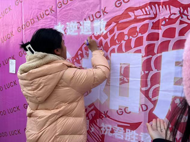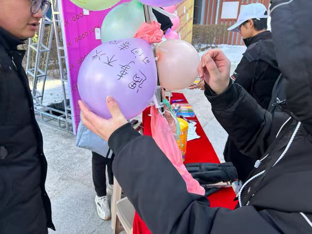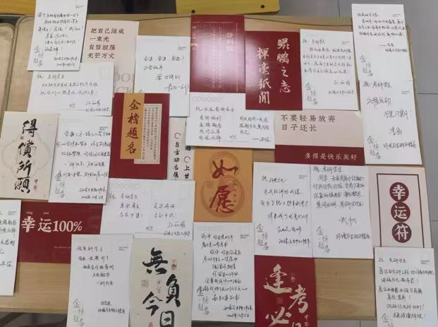 考研员工们扎消极词汇气球、系内员工写祝福话语、贴金榜题名留言贴、钉师生祝福明信片,营造校图书馆温馨、励志的环境氛围,给予考研学子支持、鼓励,帮助疏解考研学子学习压力,陪伴和助力考研学子更好度过考研时光。