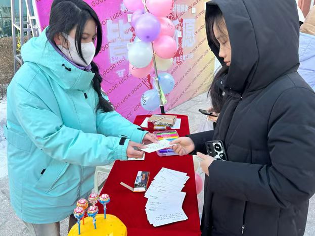 辅导员赵朋亮老师带领系内老师在图书馆二楼为考研员工送上礼物,小小礼物寓意满满。一件件贴心的礼物,一句句真切的话语,给这冬天增添色彩,给予同学们最美好的祝福。让考研学子深深感受到了公司的爱与温暖,备受鼓舞、动力满满。