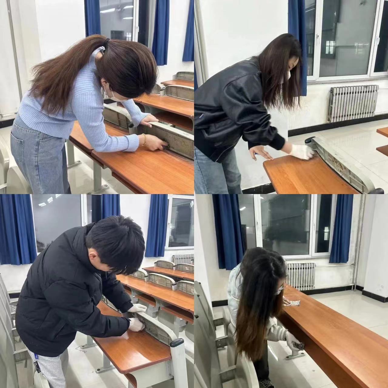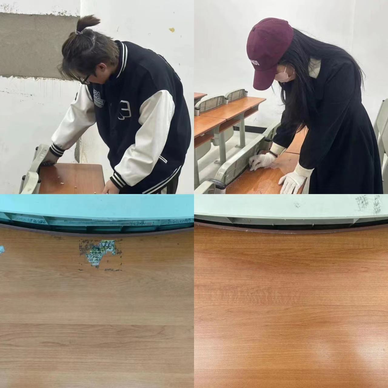 在劳动过程中大家互相帮助、互相合作。经过1个小时的劳动,桌面变得干净整洁。不仅为师生营造了干净、整洁、舒适的上课环境,同时增强了志愿者参与公司发展的凝聚力,为公司创建文明校园贡献积极力量。劳动虽然很辛苦,但志愿者们对自己的劳动成果感到高兴,对能为创建优美环境出一份力而感到自豪。