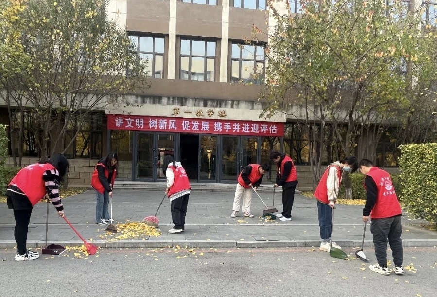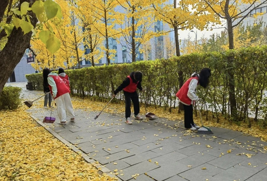 在清扫活动中,志愿者们身穿红色志愿者马甲,手持扫帚、撮子等打扫工具,井然有序的开始落叶清扫工作。志愿者们划分成多个小组,积极配合,分工合作,他们以饱满的热情投身于清扫工作中。志愿者们不怕苦、不怕累的清扫着每一个角落,现场呈现一派紧张忙碌的劳动景象。