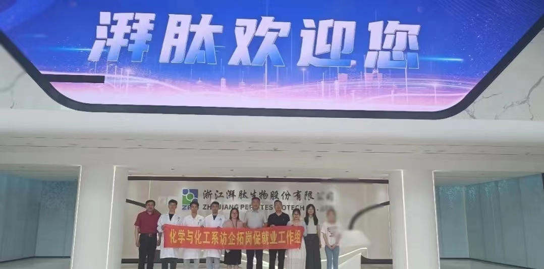 在徐经理的陪同下,化学与化工系就业工作组一行对公司的生产车间、实验室、员工公寓、活动室进行参观,实地深入了解了员工工作环境、厂区建设及浙江湃肽产品开发及应用。
