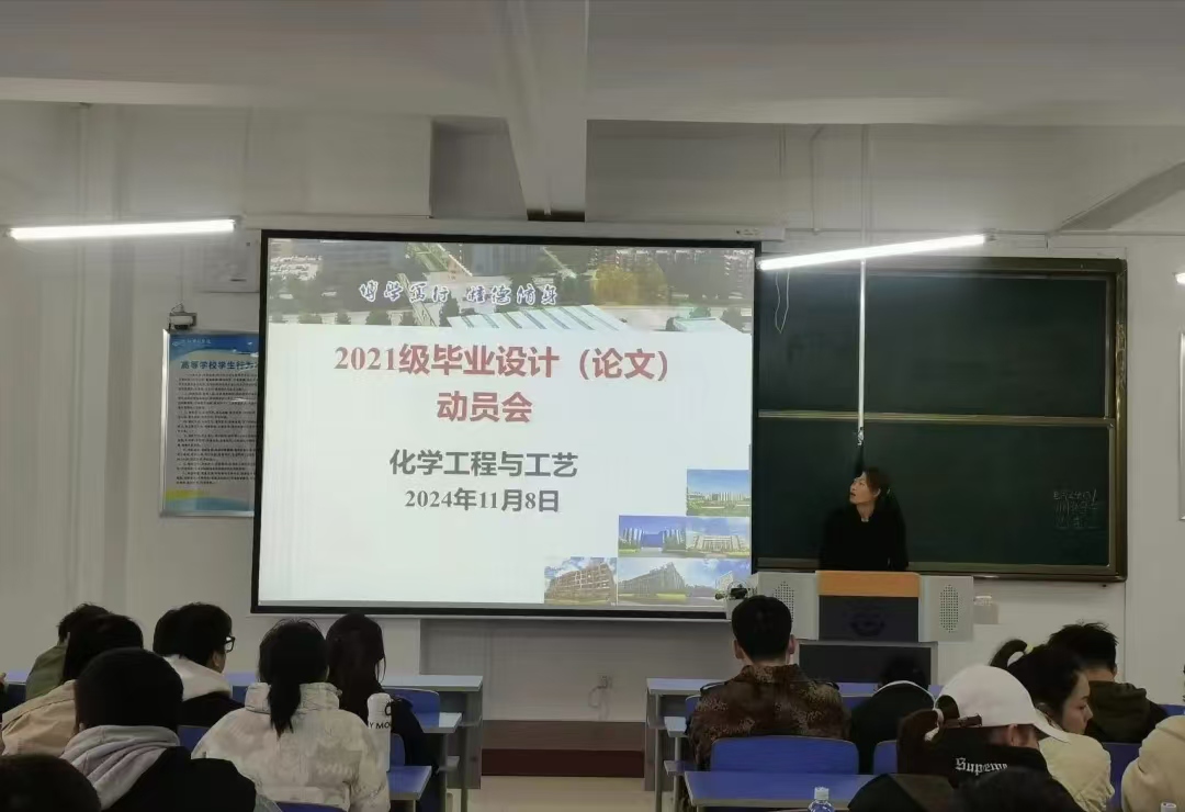 为帮助2025届毕业生顺利开展毕业论文(设计)工作,明确论文(设计)的要求与时间节点安排,化学与化工系化学工程与工艺教研室于2024年11月8日下午隆重召开了2025届毕业论文(设计)动员大会。化学工程与工艺教研室全体教师及全体化工专业毕业班员工参加此次会议。