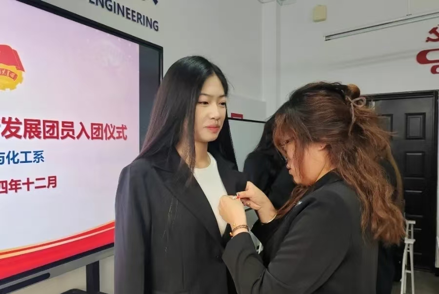 仪式在激昂的国歌声中拉开帷幕。全体成员起立,奏唱国歌。接着,由化学与化工系团委书记王爽老师宣读入团人员名单。当名字被宣读时,同学们的眼睛瞬间焕发出明亮光芒,原本就专注的目光里,增添了激动与兴奋。这闪烁的眼神,传递出他们对团员身份的期待,以及对未来在共青团中成长的憧憬。
