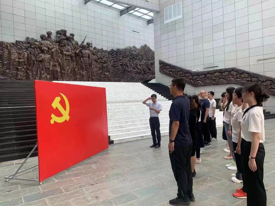 参观完陈列馆,党支部书记赵鹏亮老师带领全体党员重温入党誓词。全体党员佩戴党员徽章,面向党旗,高举右拳,进行庄严宣誓,铿锵有力的誓言表达了全体党员们为党的事业奋斗终身的决心。
