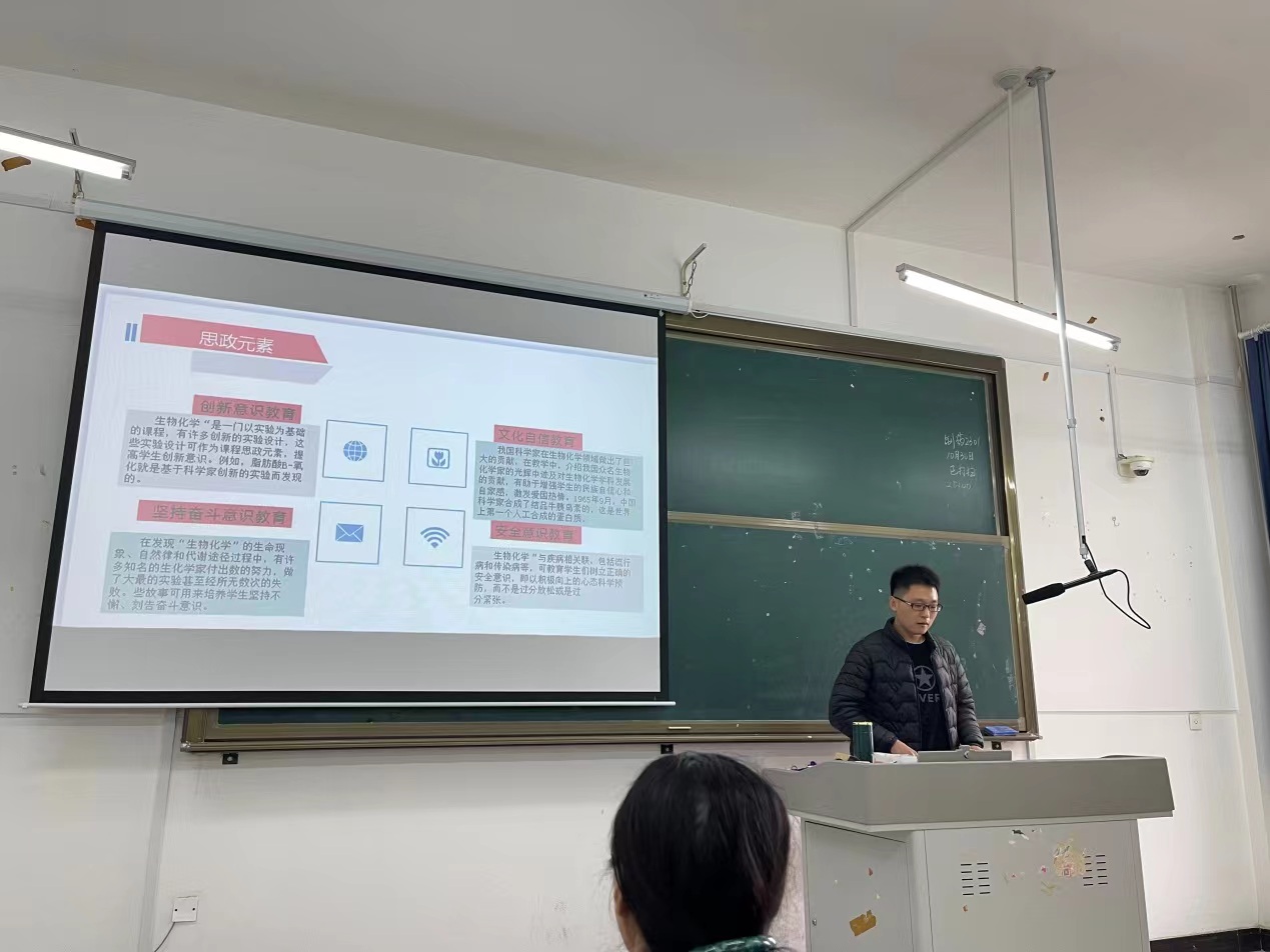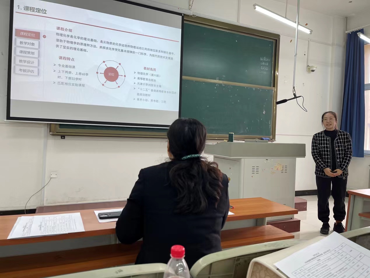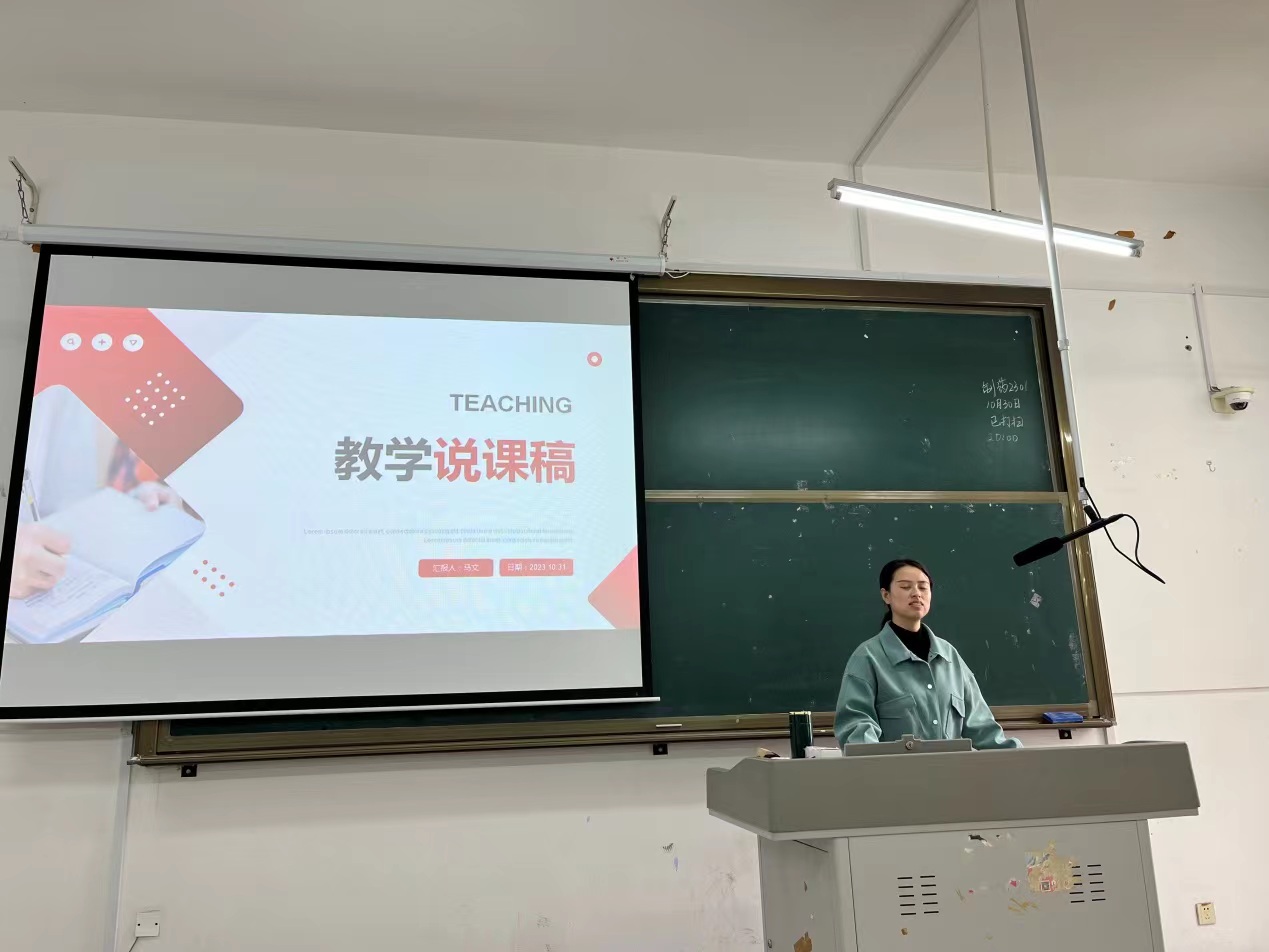 2023年10月31日,化学与化工系组织十名青年教师参加了说课大赛系内选拔赛,并邀请系里教学经验丰富的老教师作为评审专家进行打分点评。其中马文等五名青年教师采取线下说课的方式,杜新春等五名教师由于外出培训的原因采取线上说课的方式参加比赛。十位老师分别选取本学期自己所教授课程中的某一章节内容,从教材分析、目标分析、过程及效果分析三大方面,对自己所选的章节内容进行了全面透彻的分析,其中还融入了课程思政、结合生活实际对具体的知识点作了详细讲解。如下是各位青年教师的说课现场: